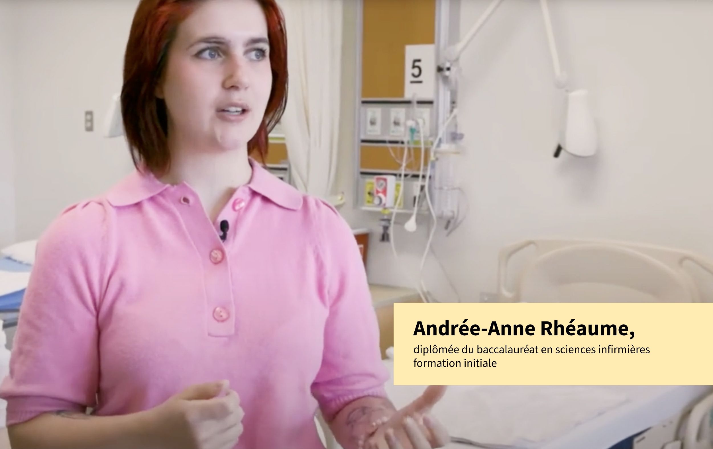 Andrée-Anne Rhéaume, diplômée du baccalauréat en sciences infirmières – formation initiale, partage avec sincérité les raisons qui l’ont menée vers la profession infirmière. Animée par le désir profond d’aider les autres, elle a su dès son premier stage qu’elle était à sa place. Chaque journée passée aux côtés des patients et de ses collègues confirme son choix : elle est faite pour ce métier.