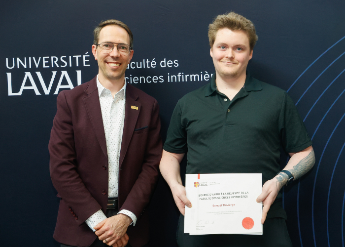 La Bourse d’appui à la réussite de la Faculté des sciences infirmières (2 500 $) a été remise à Samuel Thivierge, étudiant au baccalauréat en sciences infirmières (cheminement DEC-BAC), afin de soutenir son parcours universitaire à un moment clé de son cheminement.